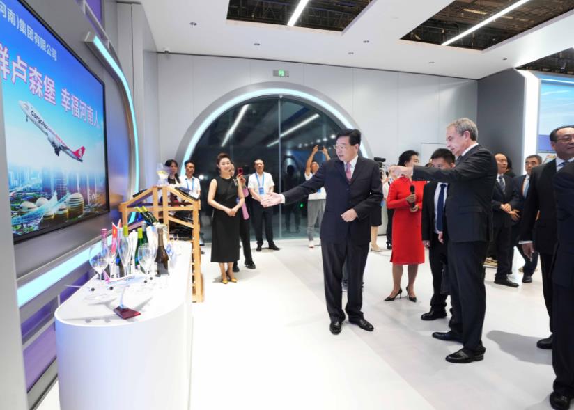 論壇開始前,與會嘉賓參觀了主題展臺。在中豫航空集團展臺前,嘉賓們被來自盧森堡的“申根精神”葡萄酒、法國知名品牌水晶杯、德國繪有“絲綢之路”元素的骨瓷等產(chǎn)品吸引;詳細了解了鄭盧“空中絲路”在中歐互聯(lián)互通、經(jīng)貿往來中發(fā)揮的橋梁作用。