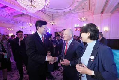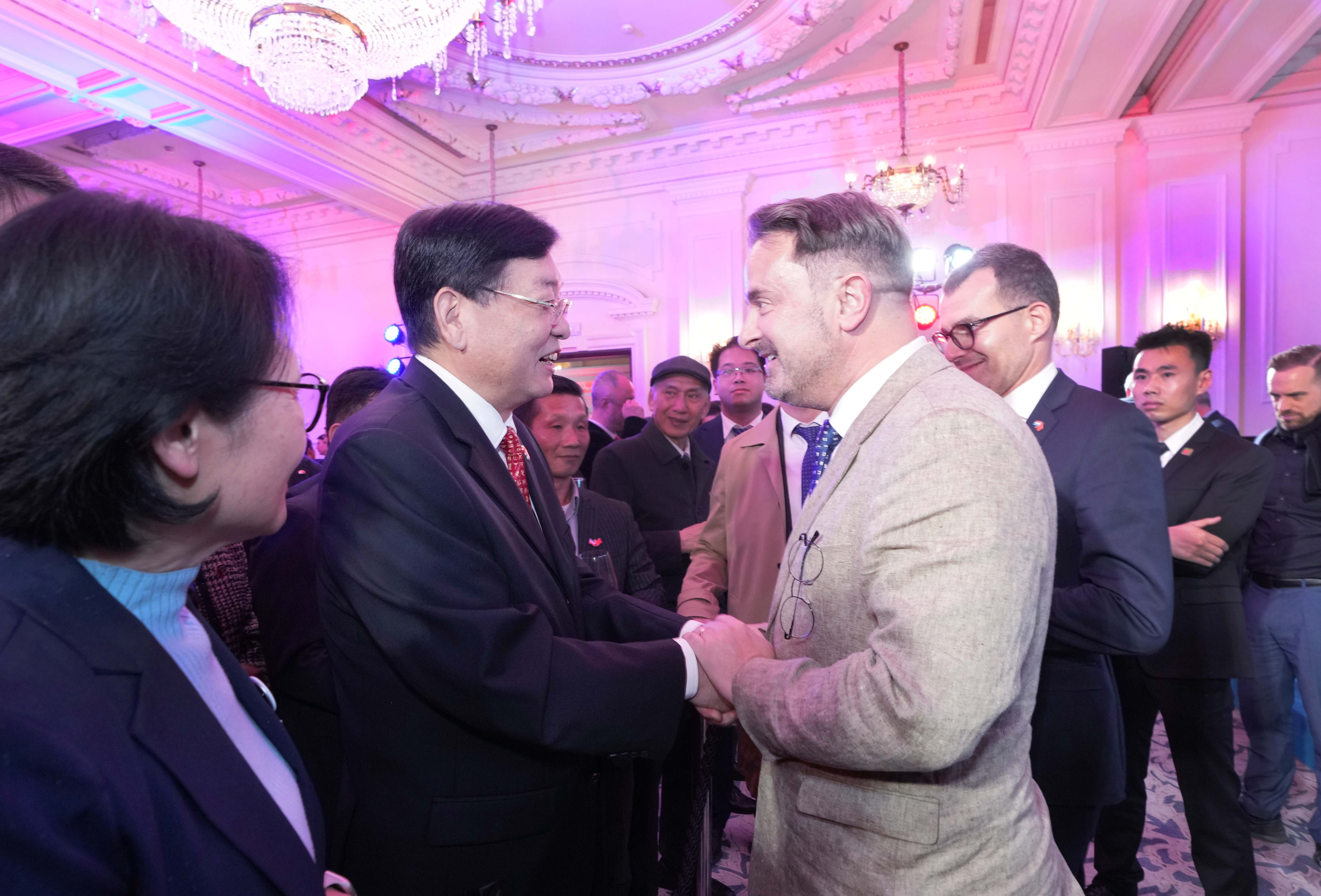 貝泰爾在招待會(huì)的致辭中簡要回顧了商貿(mào)團(tuán)在北京和上海的交流情況,對(duì)參加招待會(huì)的各方代表表示感謝。致辭后,講臺(tái)上的貝泰爾看到張明超一行很是驚喜,立即向老朋友們舉手示意,并在隨后的自由交流環(huán)節(jié)與盧睿朗一起同張明超交談。