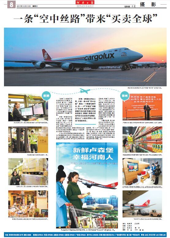 在8次報(bào)道中,既有會(huì)前的“熱身”宣傳,又有會(huì)中的集中點(diǎn)擊,還有會(huì)后的回顧追蹤,形成系列,精彩紛呈。13日,《河南日?qǐng)?bào)》以圖文并茂的整版篇幅,對(duì)河南航投與盧貨航的合作,尤其是“新鮮盧森堡”雙向跨境E貿(mào)易進(jìn)行了詳細(xì)報(bào)道。整個(gè)報(bào)道以新聞攝影為主,既有盧貨航“鄭州號(hào)”波音747-8F全貨機(jī),也有鄭-盧航線的專業(yè)操作流程展示,還有河南百姓采購“新鮮盧森堡”商品的真實(shí)場景……以鄭盧“雙樞紐”為典型案例,圍繞“一條‘空中絲路’帶來‘買賣全球’”這一主題,生動(dòng)展現(xiàn)了河南省依靠藍(lán)天對(duì)外開放的新思路和新成就。