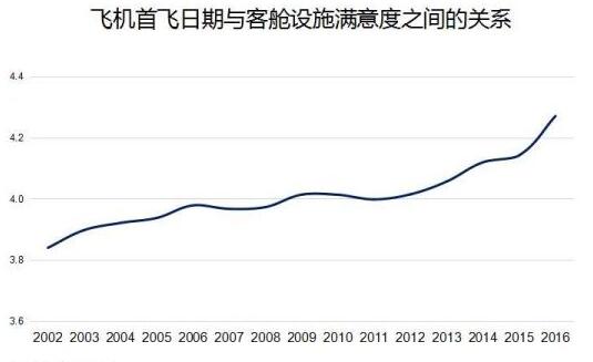 上圖是飛機首飛日期與客艙設(shè)施滿意度之間的關(guān)系,可以看出首飛日期越近滿意度越高,首飛日期越早滿意度越低,而且是持續(xù)地降低?!耙簿褪钦f我們?nèi)说男枨笤谧兓?,我們得跟上人的需求變化。行業(yè)的標準是持續(xù)的在升級的,我們需要往前追趕?!?